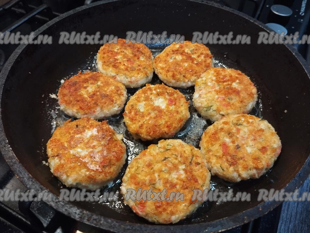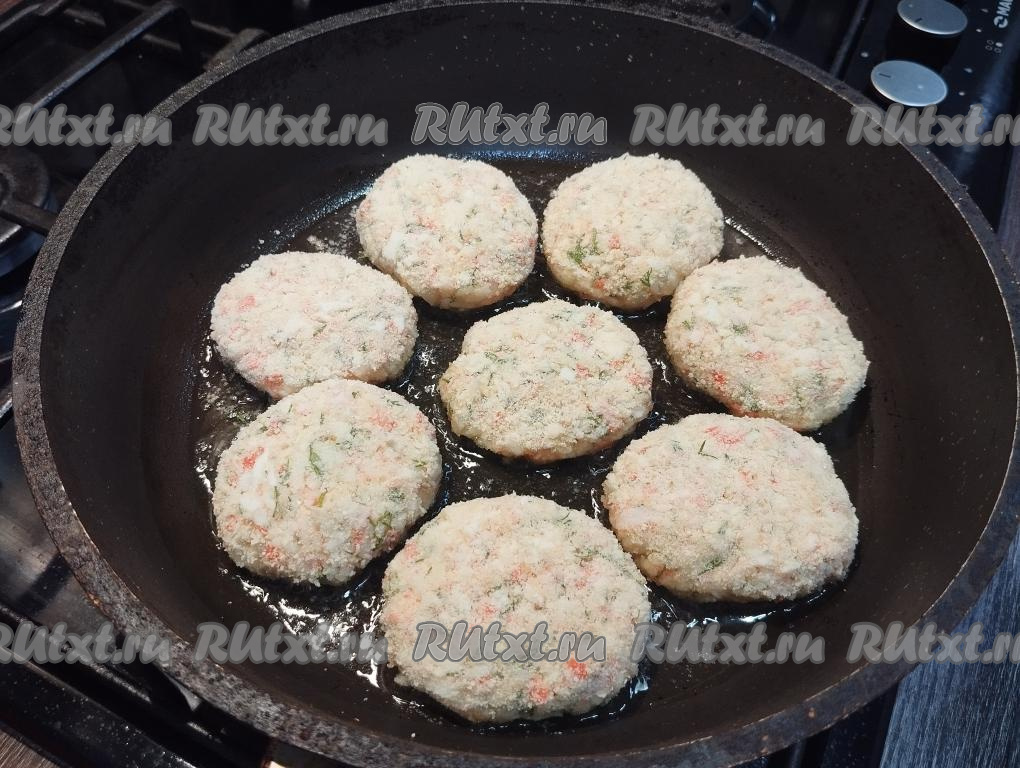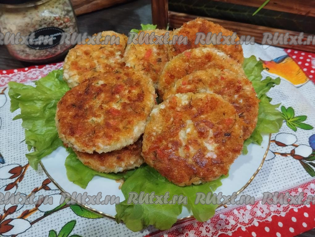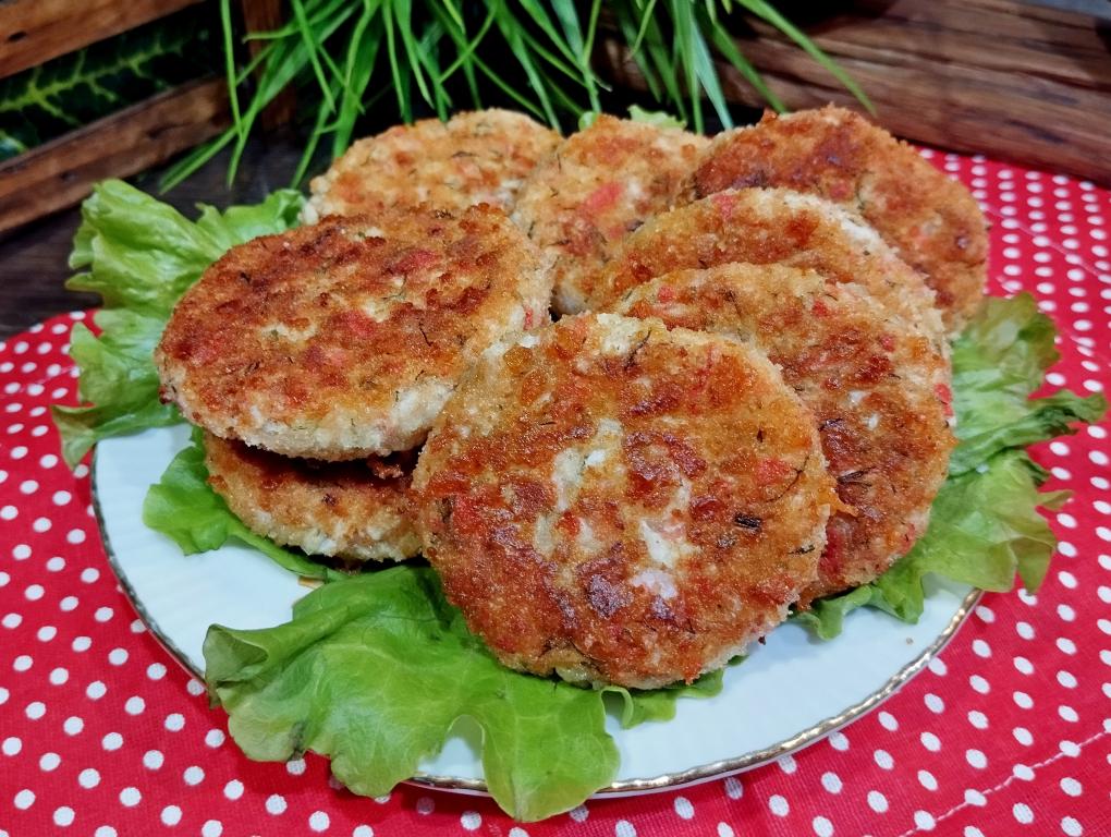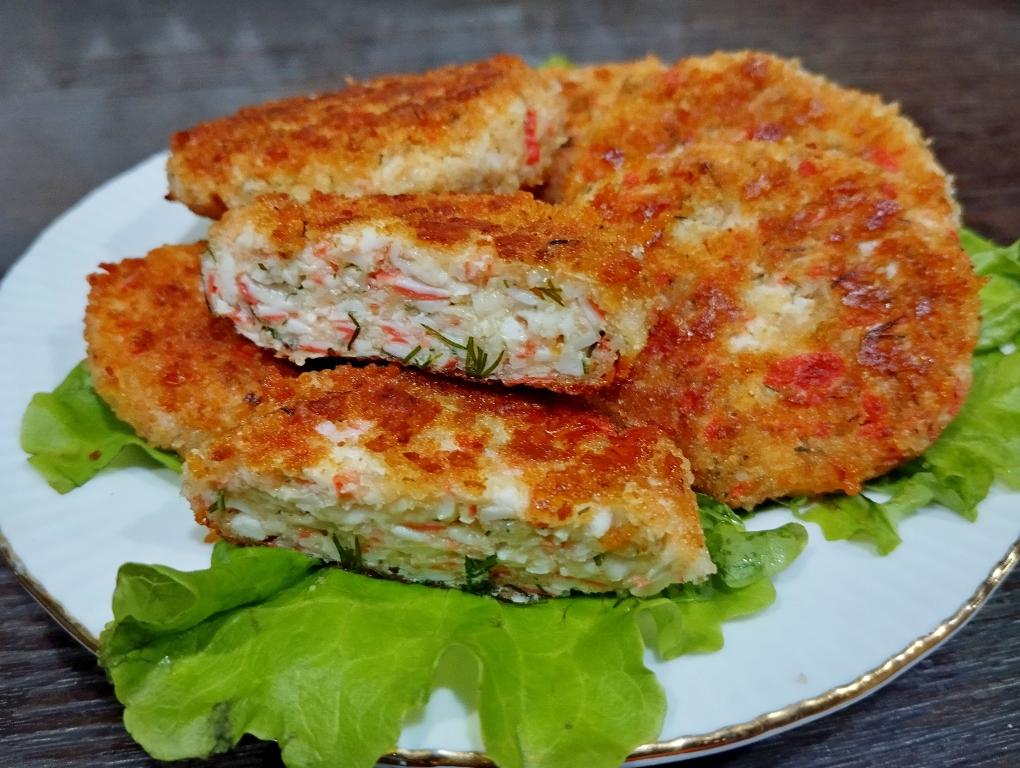 Готовые котлеты из крабовых палочек с сыром перекладываем со сковороды на тарелку и горячими, дополнив любимым гарниром, подаём к столу.