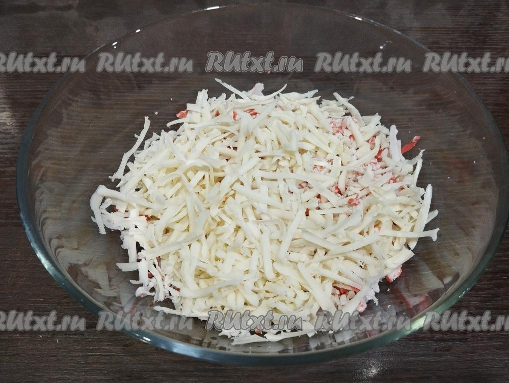 В эту же миску выкладываем сыр, натёртый на крупной тёрке.