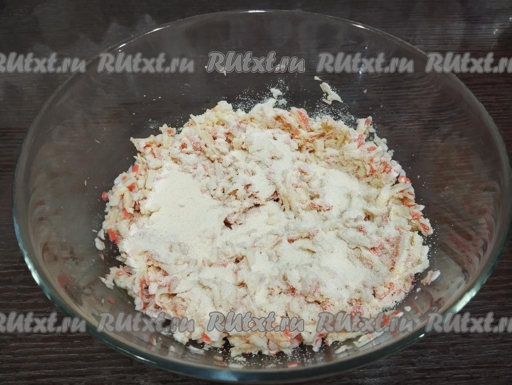 Перемешиваем содержимое миски до однородности, добавляем манку, ещё раз перемешиваем. Оставляем получившийся крабово-сырный фарш минут на 10, чтобы манка немного набухла.