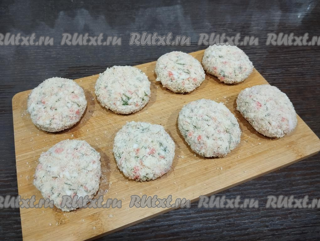 Постепенно формируем и обваливаем в панировочных сухарях все котлеты из крабовых палочек и сыра.