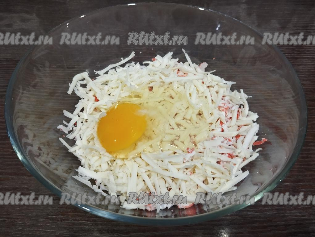 Разбиваем сырое яйцо к сыру и палочкам.