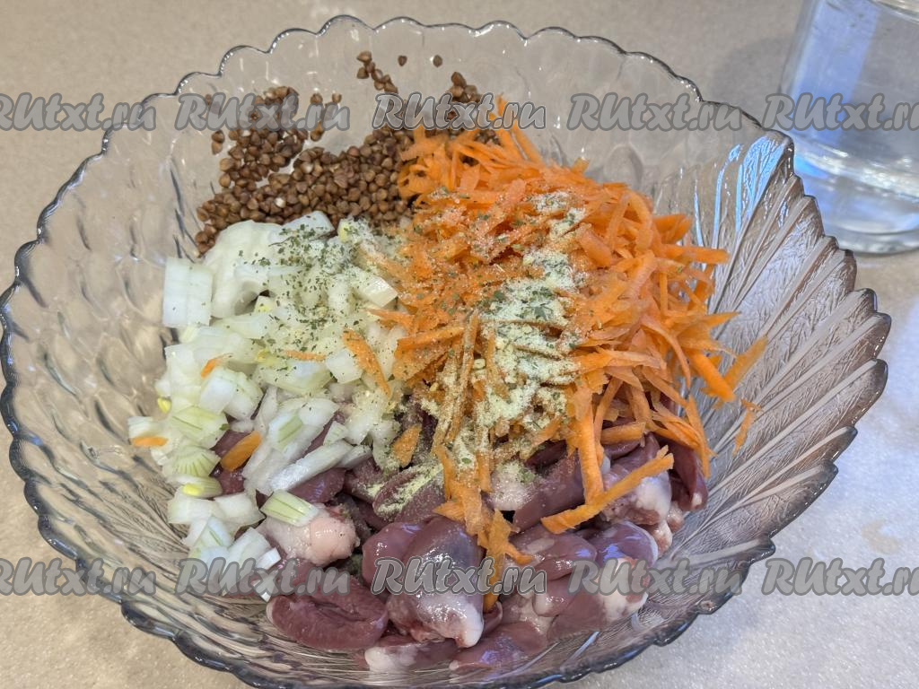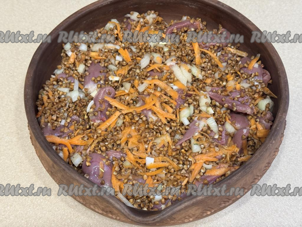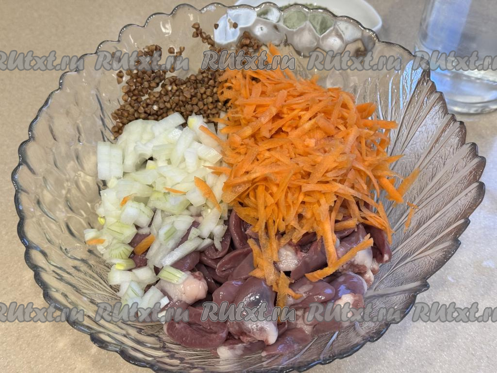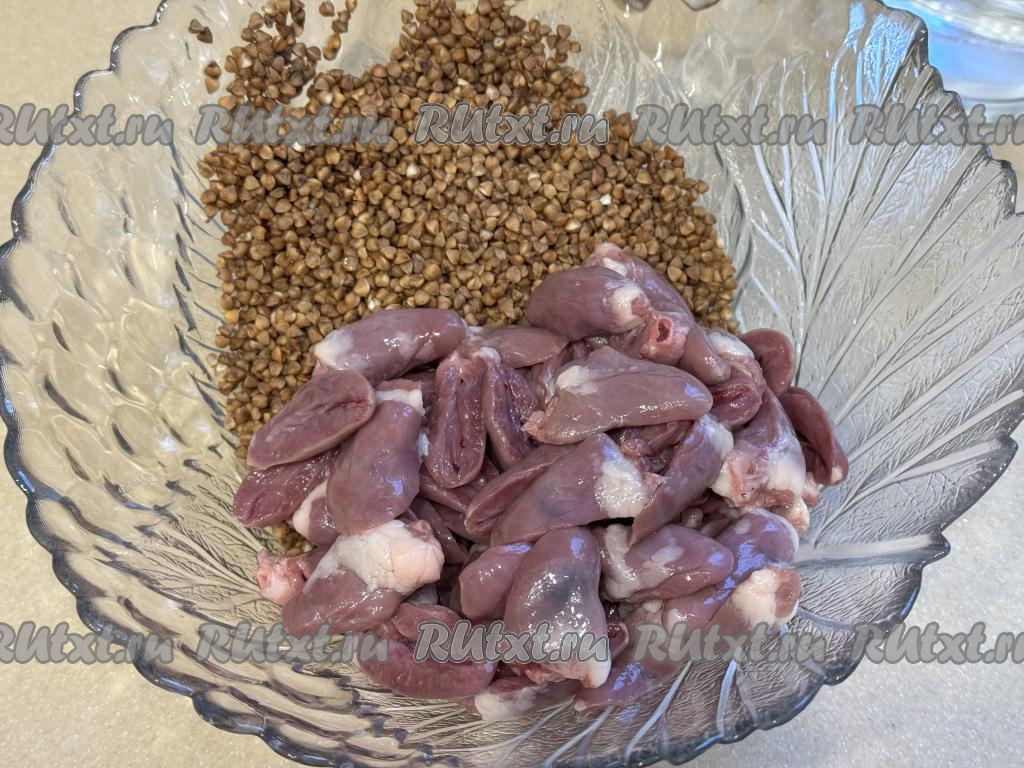 Куриные сердечки разрезать пополам, промыть водой, убирая сгустки крови. В глубокой миске соединить сердечки и гречку.