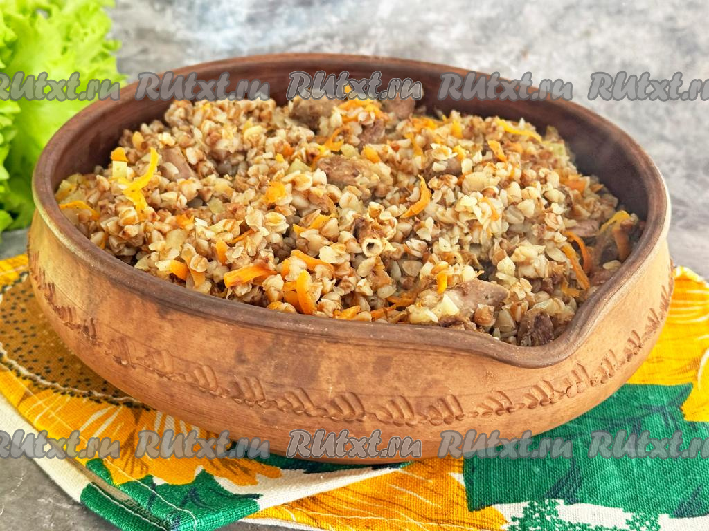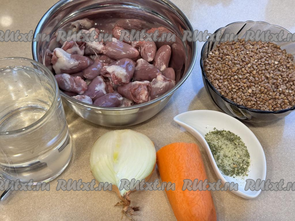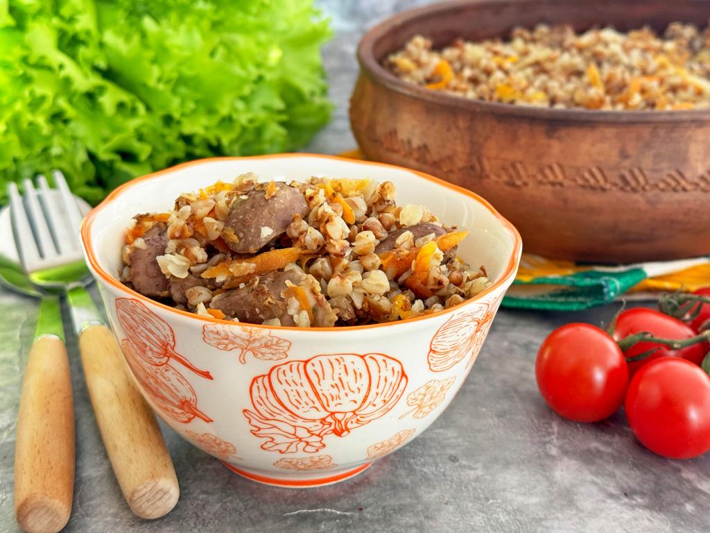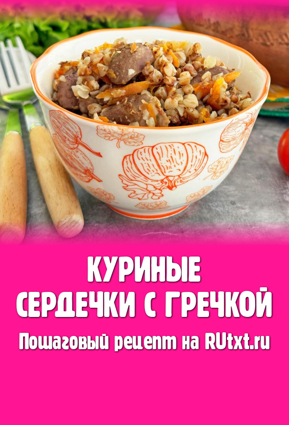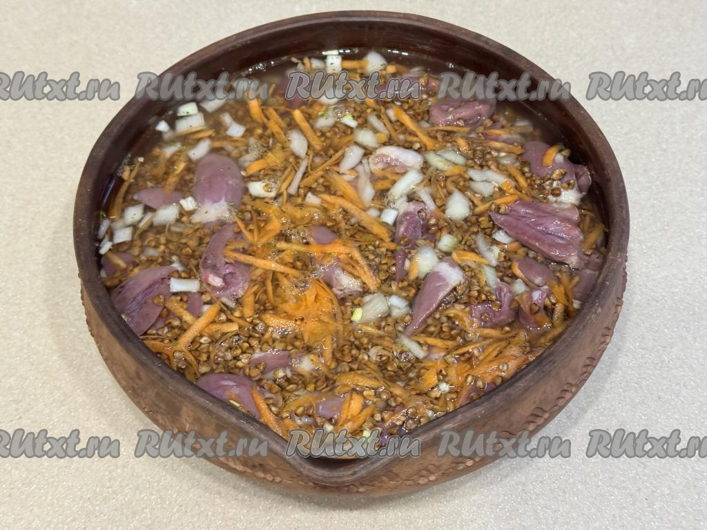 Куриные сердечки разрезать пополам, промыть водой, убирая сгустки крови. В глубокой миске соединить сердечки и гречку.