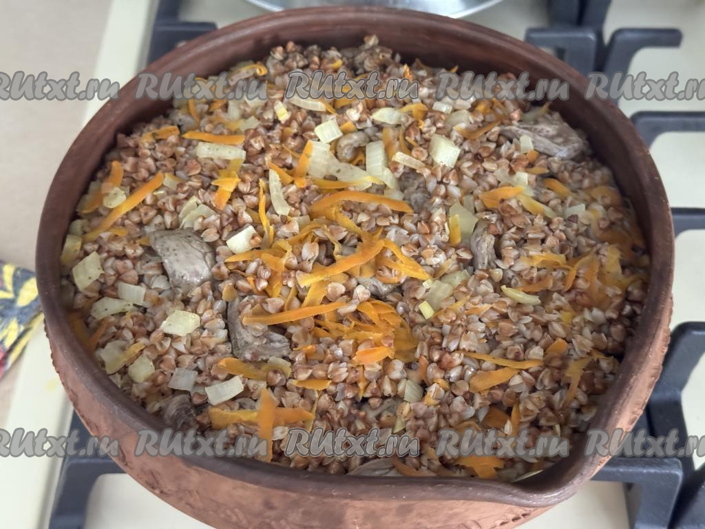 Готовое блюдо достать из духовки, перемешать. В процессе томления в духовке вода полностью впитается, гречка станет рассыпчатой, хорошо пропаренной, куриные сердечки - нежными, мягкими.