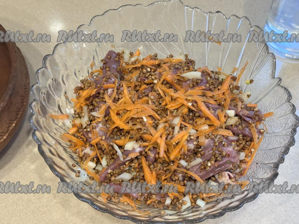 Перемешать гречку с сердечками и овощами.Шаг 5 из 9: