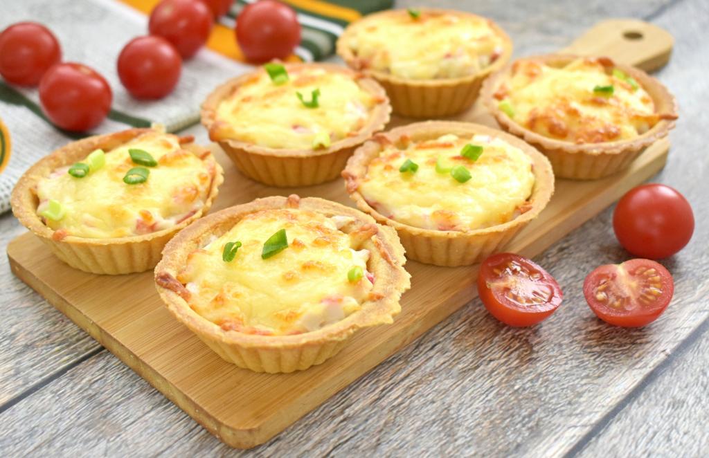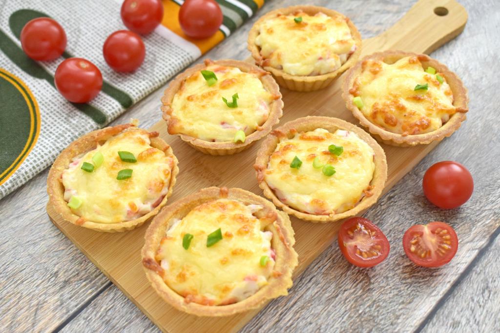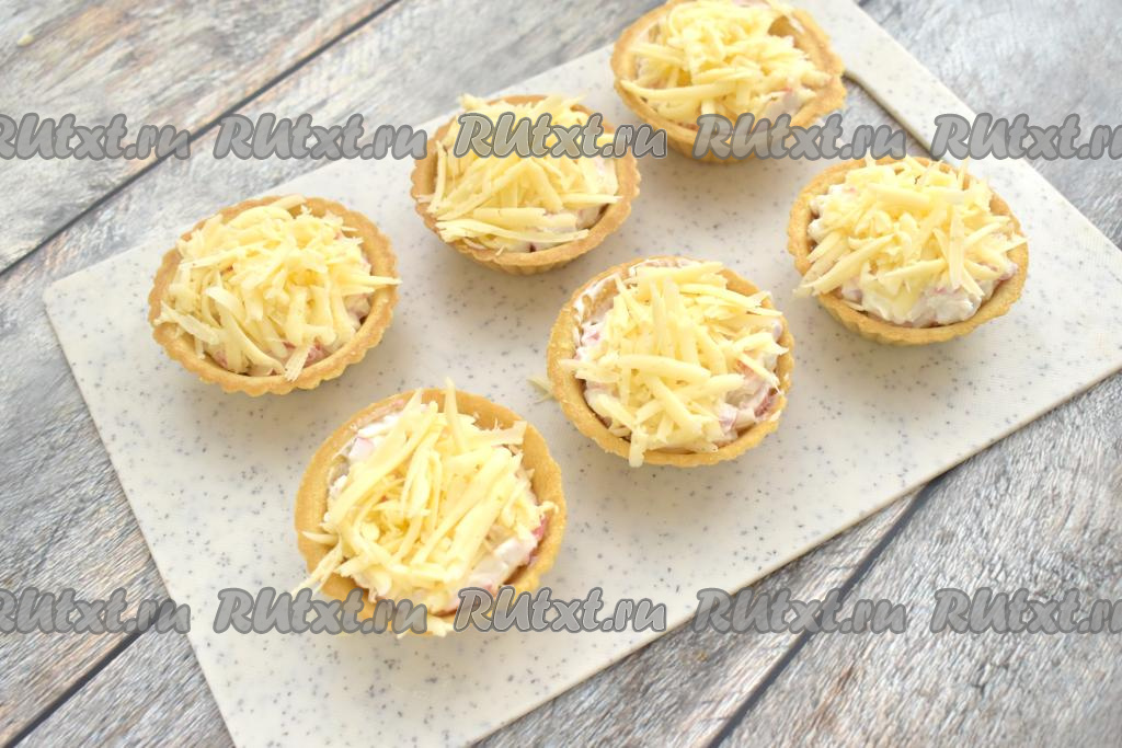 Начинку в тарталетках посыпаем сыром твёрдых сортов, натёртым на крупной тёрке.