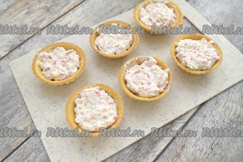 Заполняем песочные тарталетки получившейся начинкой из крабовых палочек и творожного сыра.