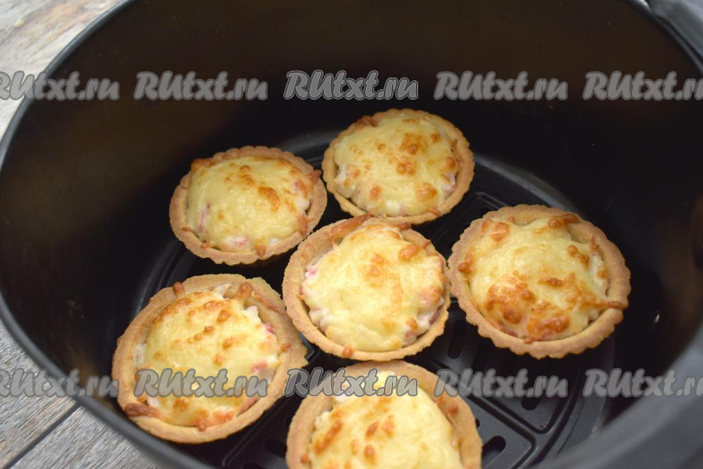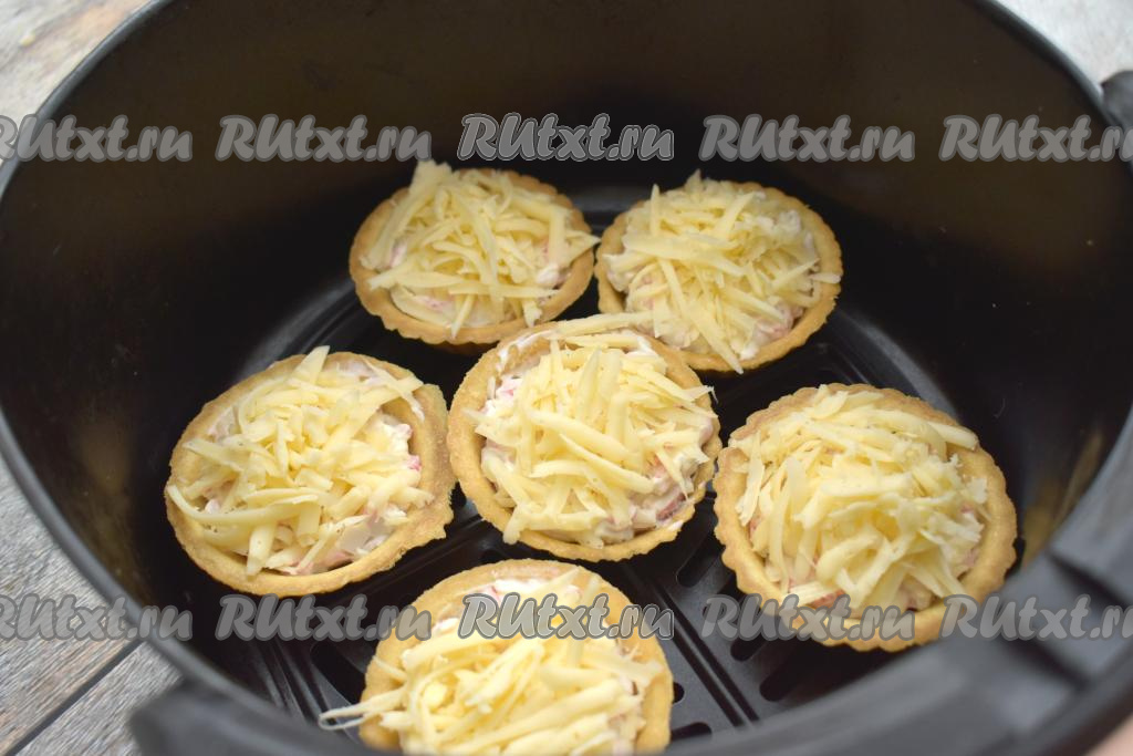 Тарталетки с крабовыми палочками ставим в чашу аэрогриля. Отправляем чашу в аэрогриль.