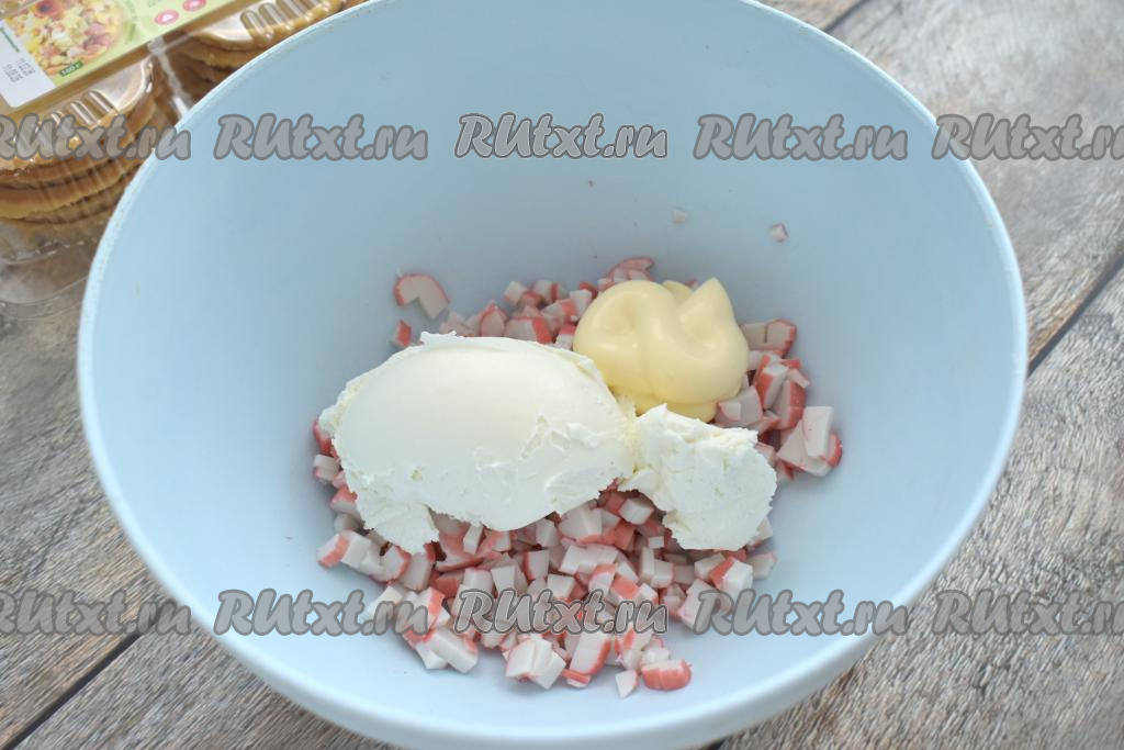 В миску с нарезанными крабовыми палочками добавляем творожный сыр и майонез.