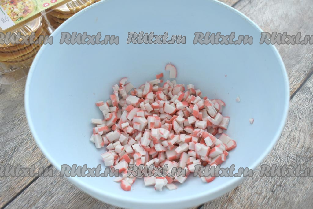 Если крабовые палочки заморожены, их нужно разморозить при комнатной температуре. Крабовые палочки вынимаем из упаковки, нарезаем на мелкие кубики, выкладываем в миску.