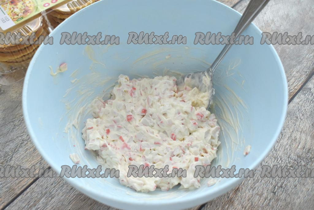 Перемешиваем крабовые палочки с майонезом и творожным сыром до получения однородной массы, после этого начинка для тарталеток будет готова.
