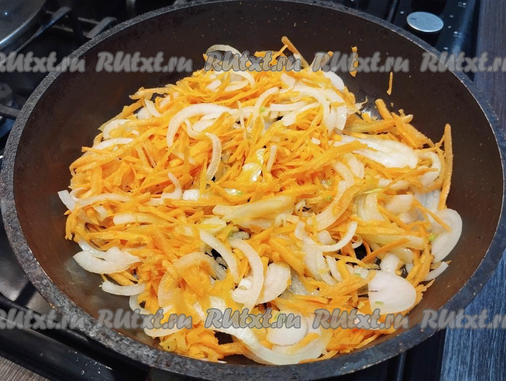 На сковороду наливаем растительное масло, разогреваем, выкладываем морковку с луком. Обжариваем овощи на среднем огне до мягкости овощей (ориентировочно в течение 7-8 минут), иногда помешивая.