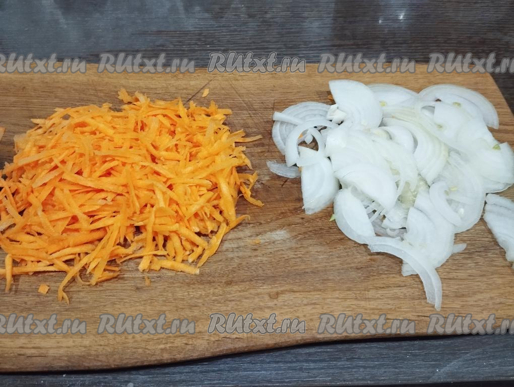 Лук нарезаем на тонкие полукольца. Морковь натираем на крупной тёрке.