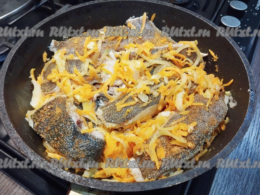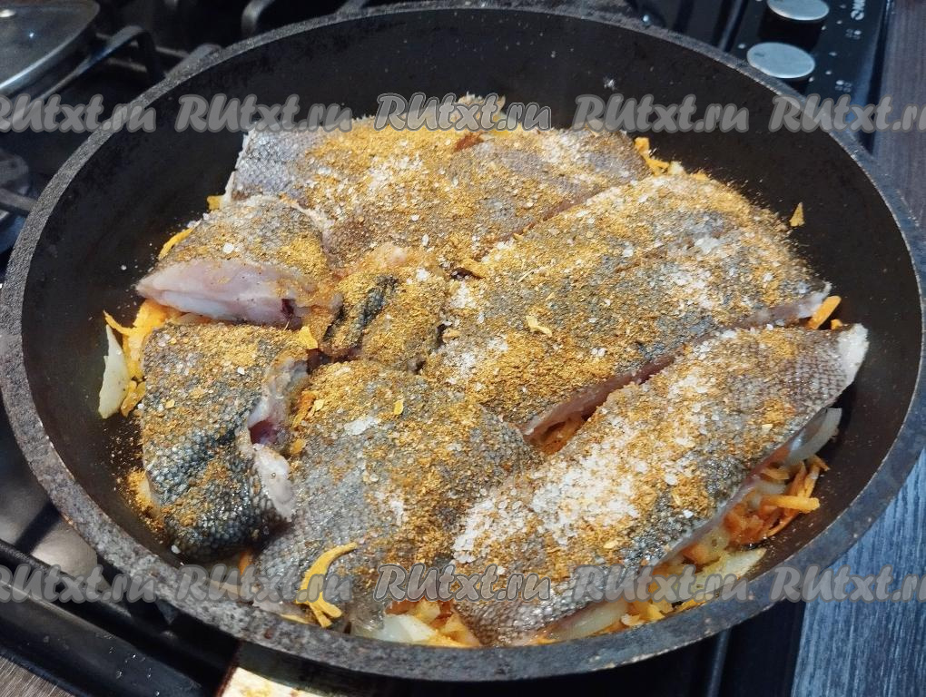 Выкладываем кусочки камбалы, добавляем соль и специи для рыбы. В состав многих специй входит соль, учитывайте это, добавляя соль. Не перемешивая, готовим рыбу на овощной подушке на огне ниже среднего 2-3 минуты.