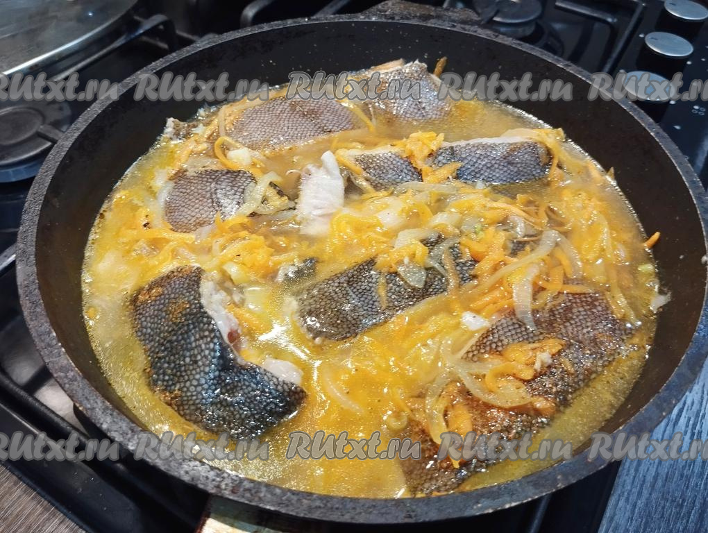 Добавляем 250 миллилитров воды. Вода должна практически полностью покрывать рыбу. Накрываем сковороду крышкой. Доводим воду до кипения, если нужно, досаливаем. Тушим камбалу с луком и морковью на минимальном огне минут 15 (до готовности рыбы).