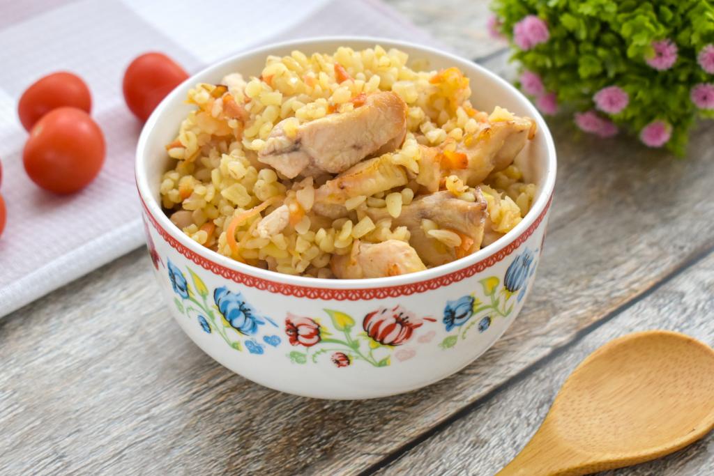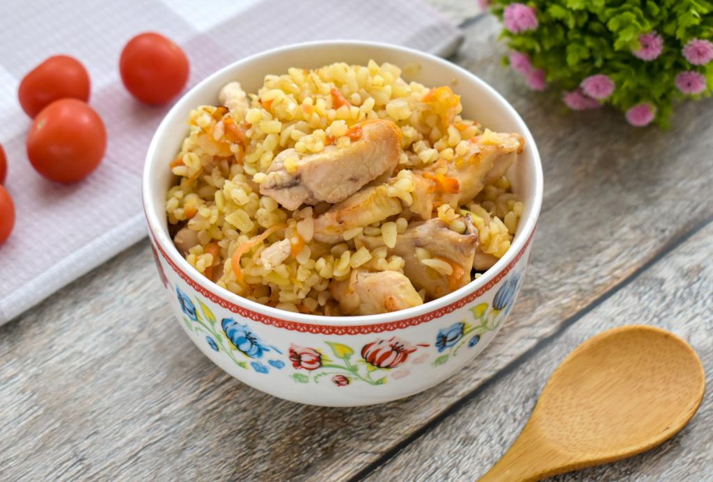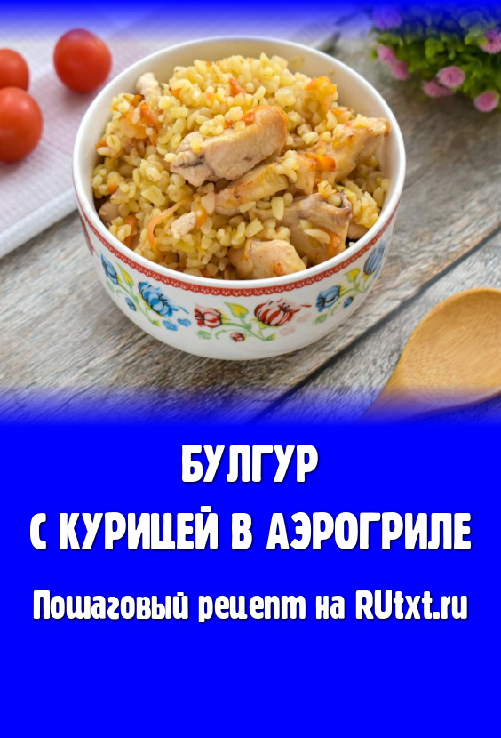Если вам нравится готовить в аэрогриле, тогда этот рецепт булгура с курицей вам точно пригодится. Булгур в процессе томления пропитывается мясными соками, становится очень рассыпчатым, ароматным, а куриное мясо - нежным, мягким. Мне очень нравится это блюдо не только за прекрасный вкус, но и за то, что одновременно готовятся и мясо, и гарнир. При подаче булгур и кусочки курицы можно дополнить любимым соусом, свежими или маринованными овощами.