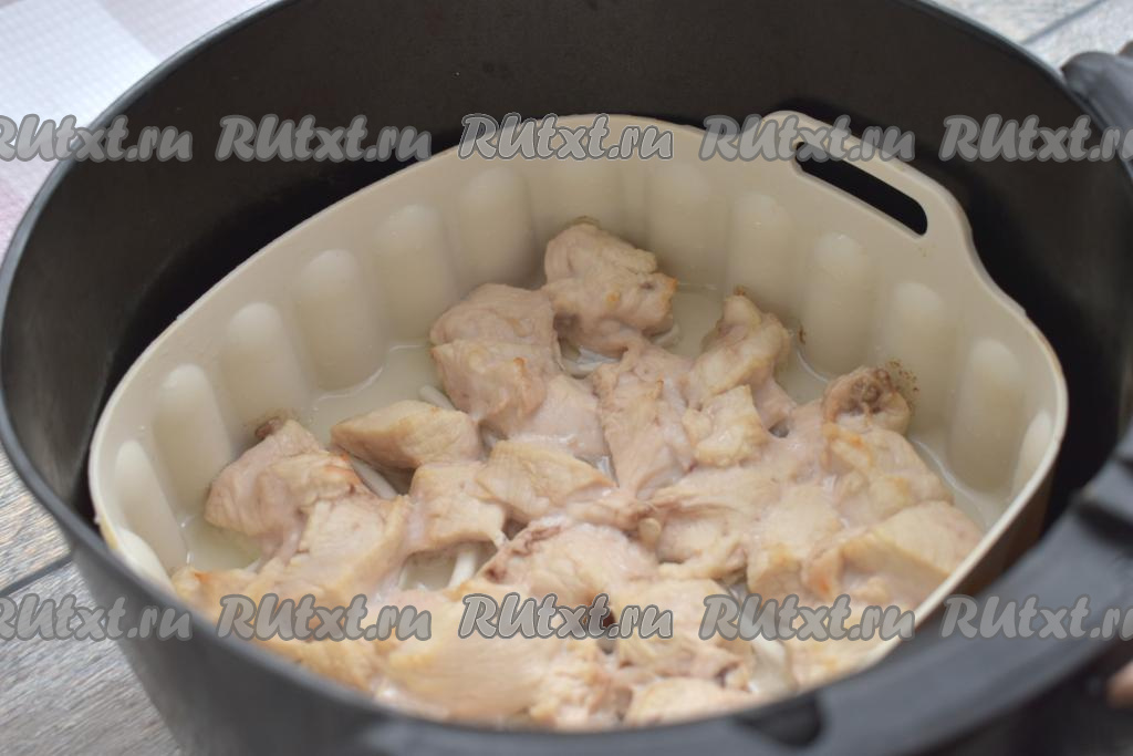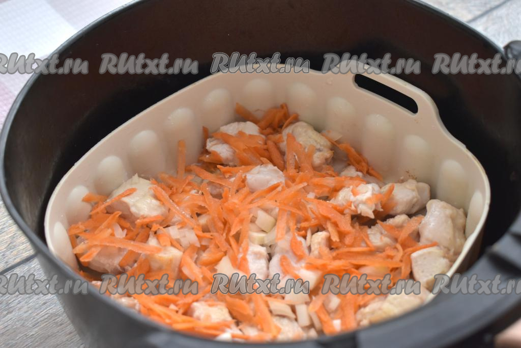 Затем достаём чашу из аэрогриля, перемешиваем кусочки куриного мяса, добавляем мелко нарезанный лук и натёртую на крупной тёрке морковку, перемешиваем. Отправляем чашу в аэрогриль, устанавливаем температуру 180 градусов, время - 8 минут. Готовим до звукового сигнала.