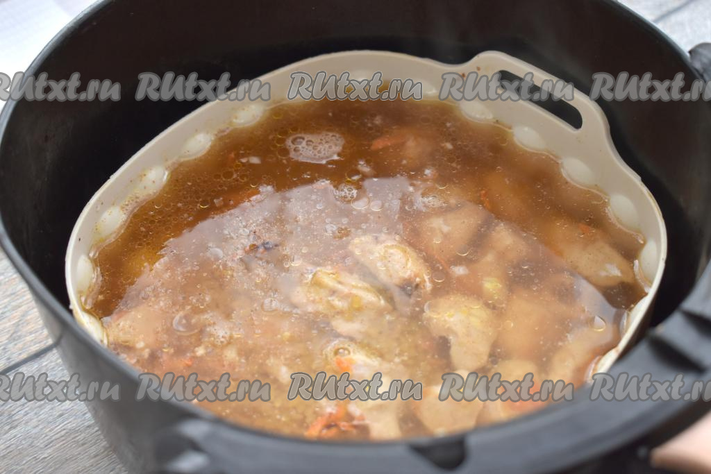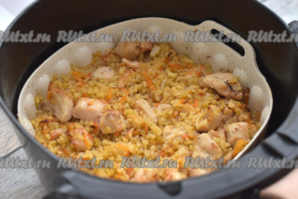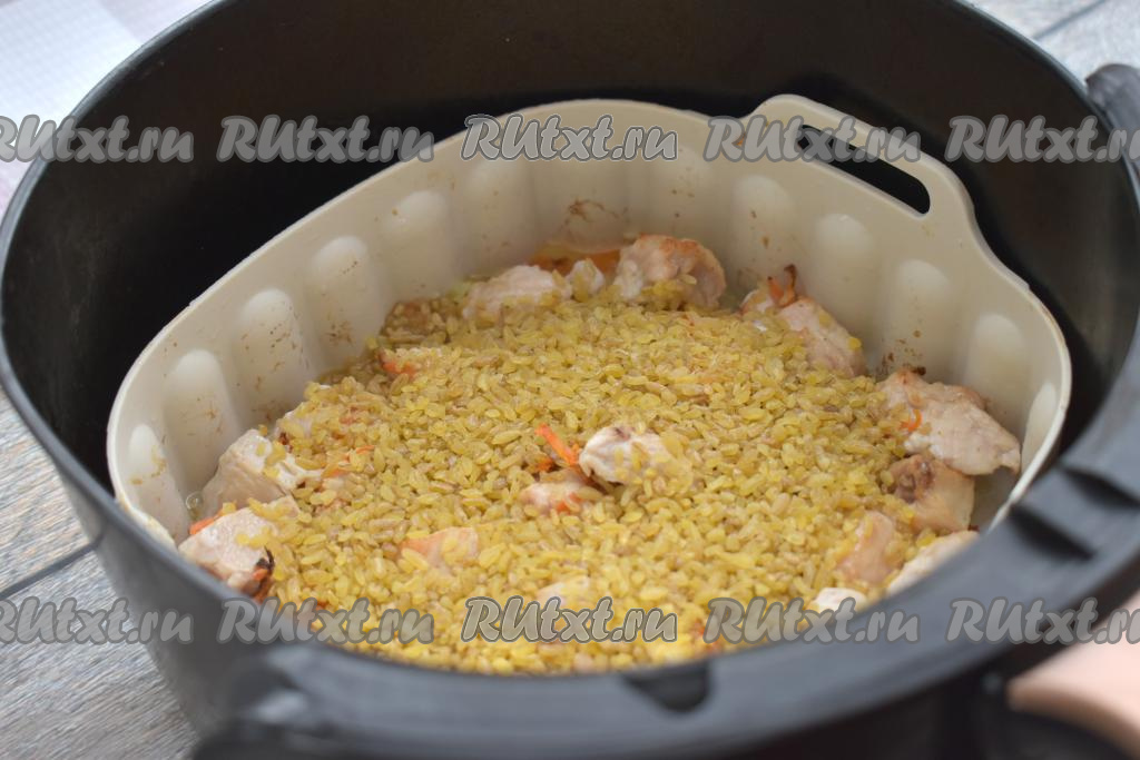 Заливаем булгур с курицей 400 миллилитрами горячей воды, снова отправляем чашу в аэрогриль.