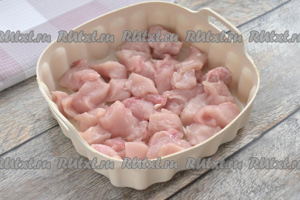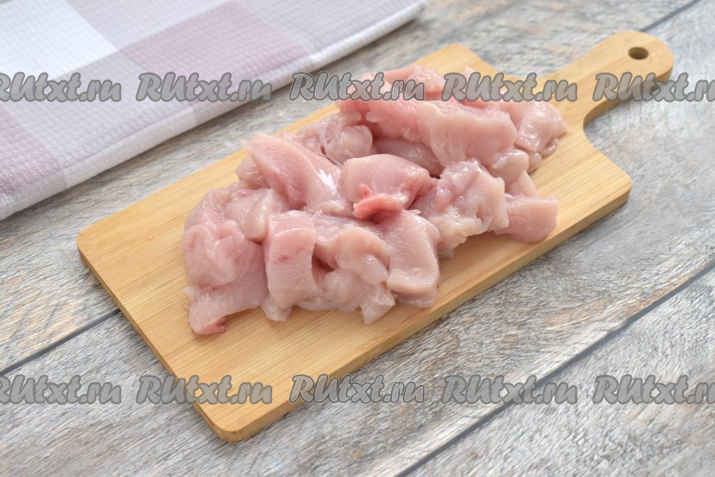 Для этого блюда можно взять мясо, срезанное с любых частей курицы (например, филе бедра или филе грудки). Я взяла филе куриной грудки. Мясо моем, обсушиваем, нарезаем на небольшие кусочки, солим, перемешиваем. Морковь и лук очищаем.