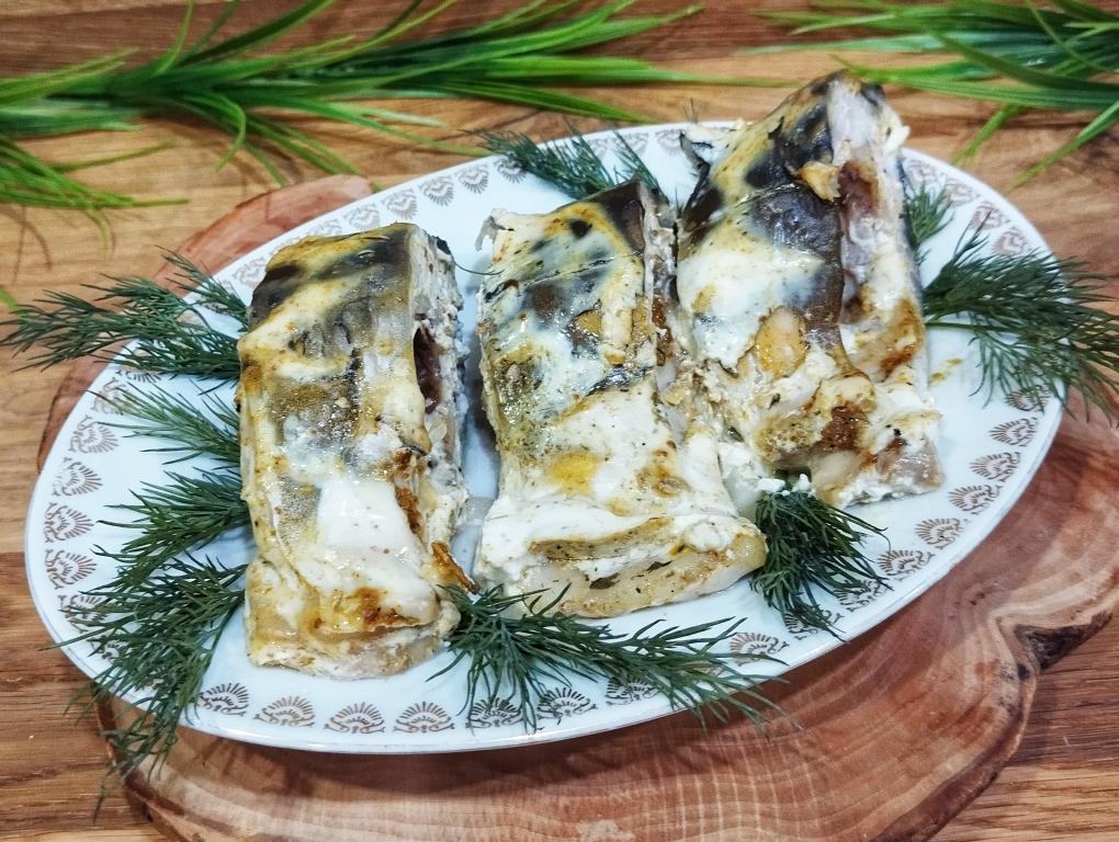 Форму с готовой рыбой достаём из духовки. Сочные, вкусные, нежные кусочки карпа, запечённые в сметане, раскладываем по тарелкам и, дополнив любимым гарниром, в горячем виде подаём к столу.