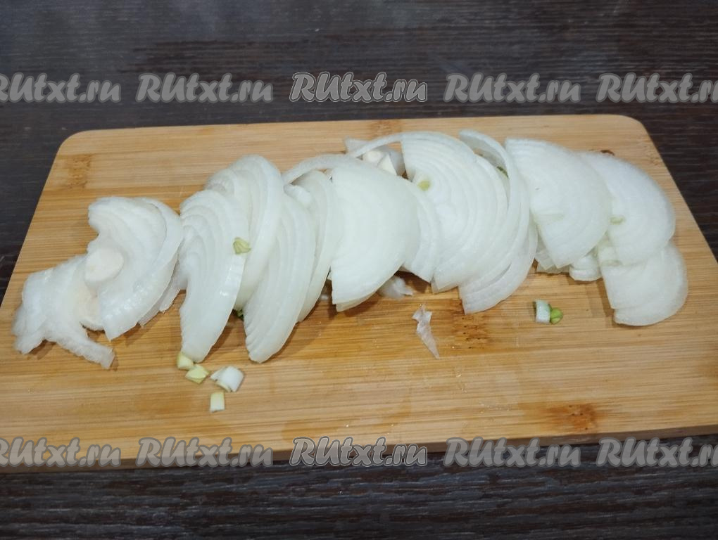 Лук очищаем, промываем водой, нарезаем на тонкие полукольца.