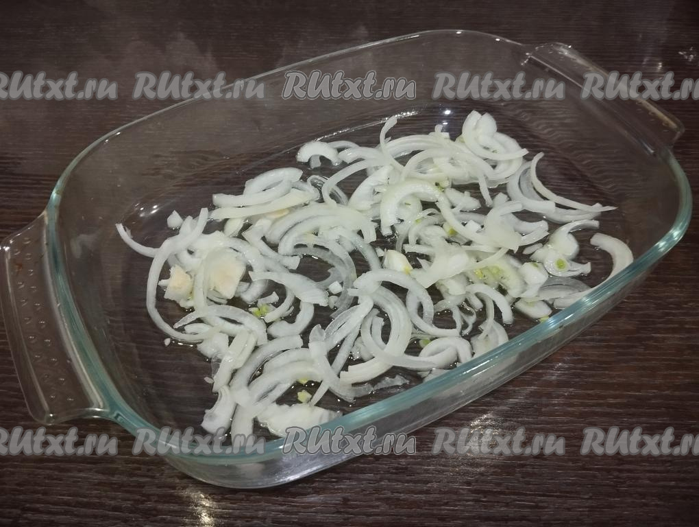 Форму для запекания смазываем растительным маслом. Равномерно раскладываем лук по дну формы.