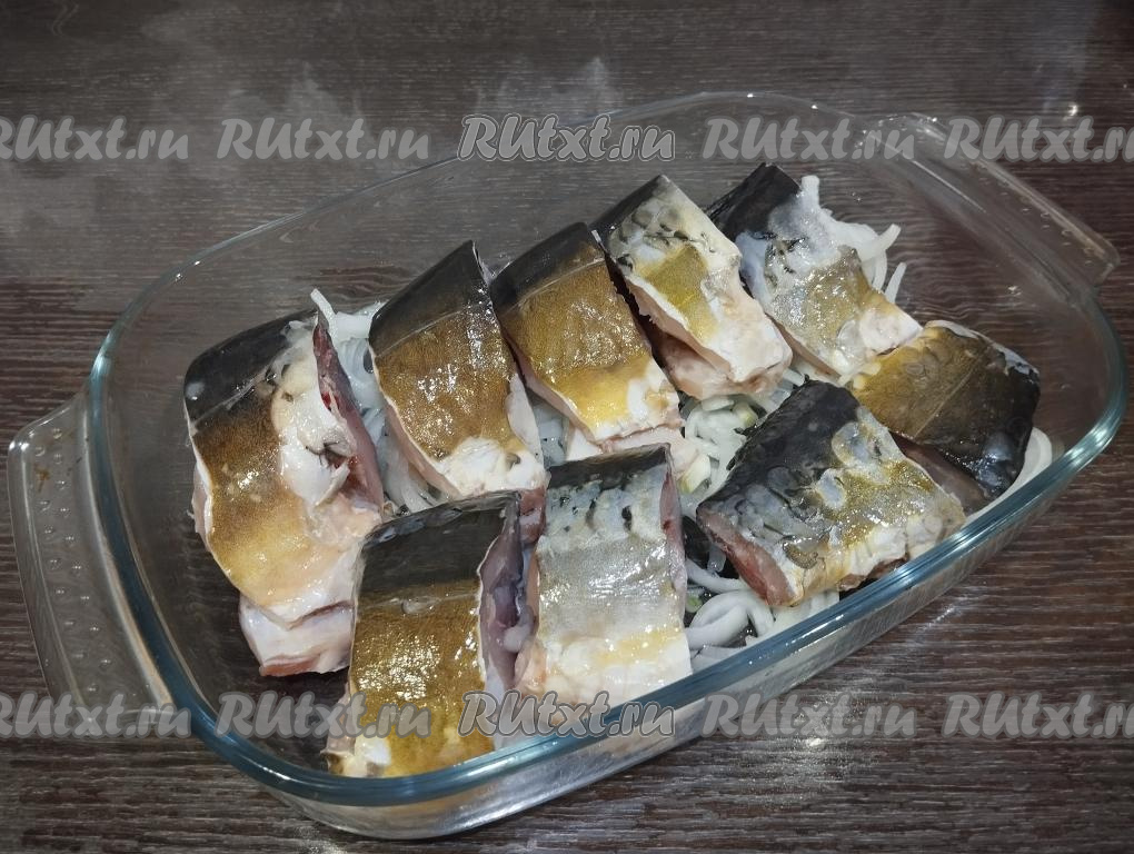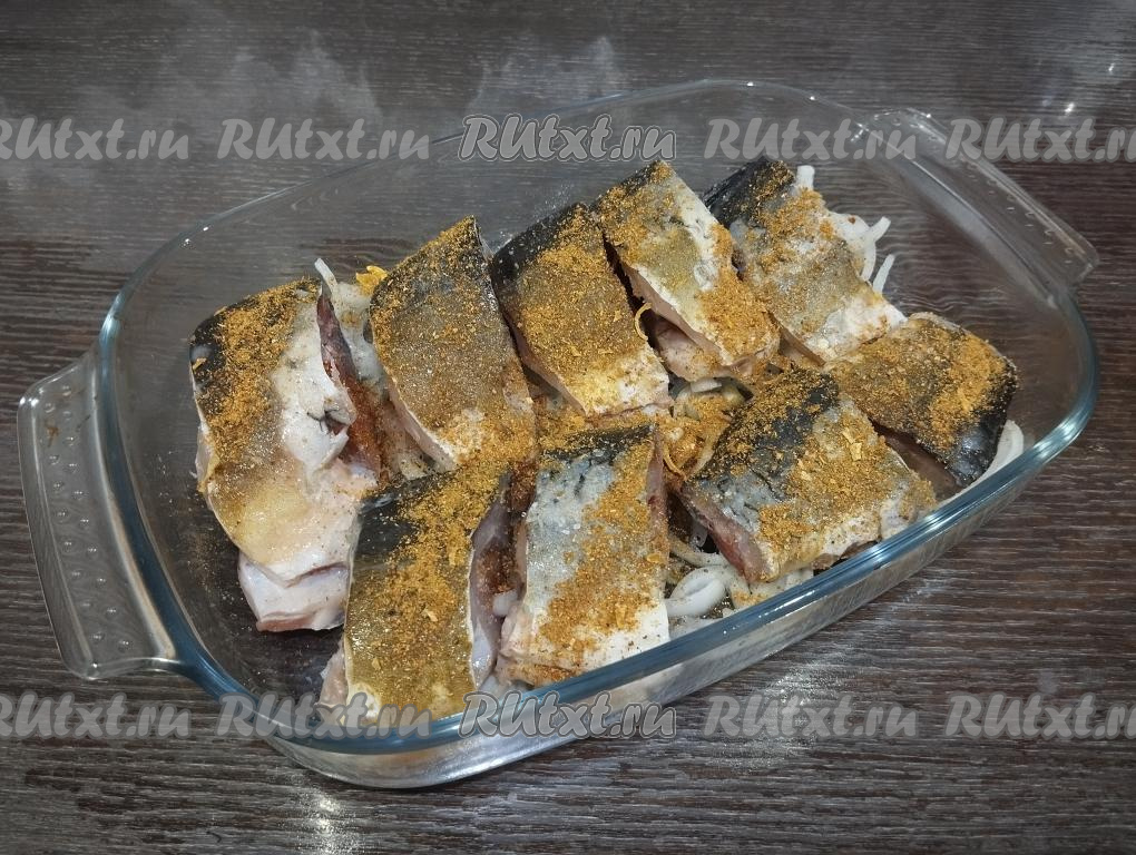 Кусочка карпа солим внутри и снаружи. Выкладываем кусочки карпа поверх лука в один слой.