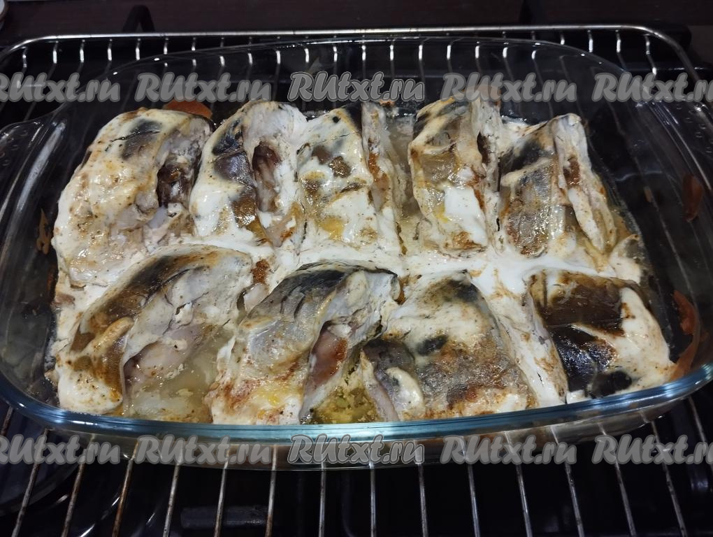 Отправляем форму в духовку, разогретую до 180 градусов, запекаем кусочки карпа в сметане минут 30.