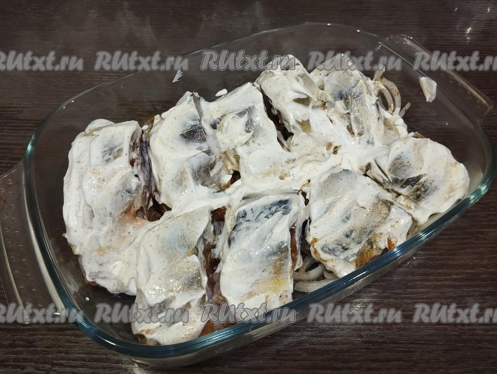 Каждый кусочек карпа сверху и с боков смазываем сметаной.