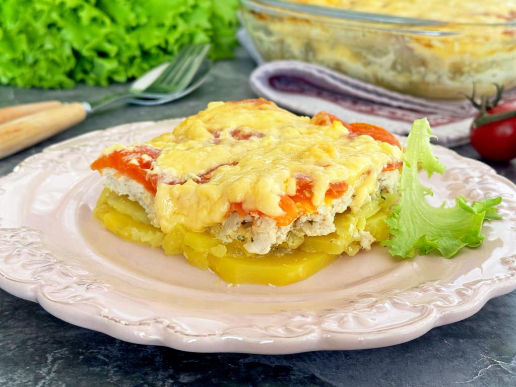 Мясо по-французски - одно из самых известных блюд, вариантов приготовления немало. В этот раз решила запечь в духовке мясо по-французски из куриного фарша. Блюдо получилось сытным, аппетитным, нежным, вкусным. Мне очень нравится в этом рецепте, что одновременно готовятся и мясо, и гарнир из картошки. Картофель, пропитываясь мясными соками, становится нежным, вкусным, а фарш, благодаря помидорам и сыру, - достаточно сочным. Все ингредиенты отлично сочетаются и дополняют друг друга. Это полноценное блюдо можно подать к столу и на обед, и на ужин.
