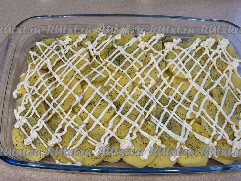 Нанести поверх картошки сеточку из майонеза.