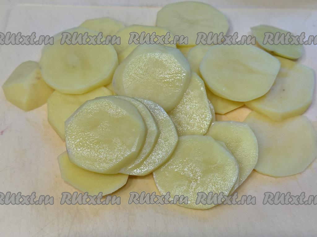 Картошку нарезать на кружочки толщиной примерно 3 миллиметра.