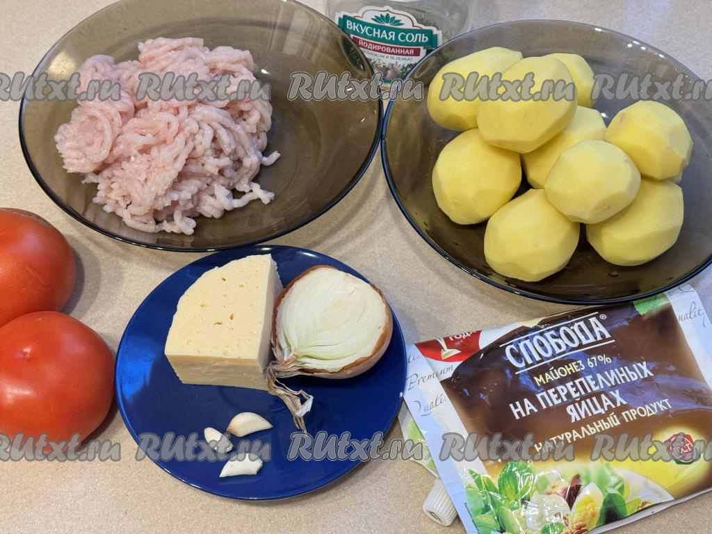 Подготовить продукты. Картошку, лук и чеснок очистить. Помидоры вымыть. Куриный фарш можно приготовить в домашних условиях, пропустив кусочки мяса курицы через мясорубку в миску. Но можно взять и покупной куриный фарш.