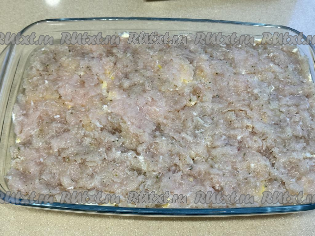 Выложить куриный фарш ровным слоем на картошку.