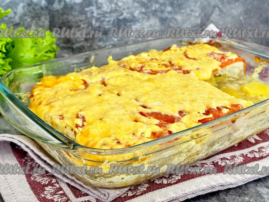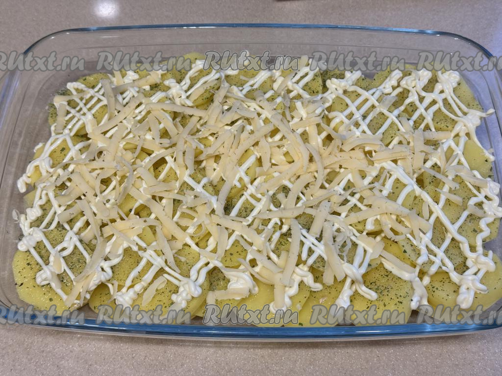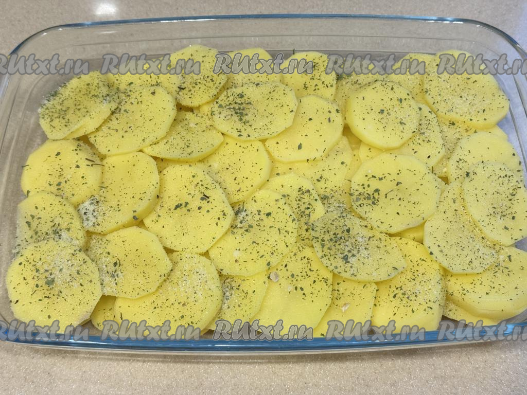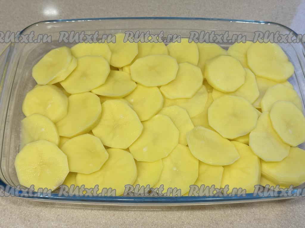 Выложить картошку в форму для запекания ровным слоем.