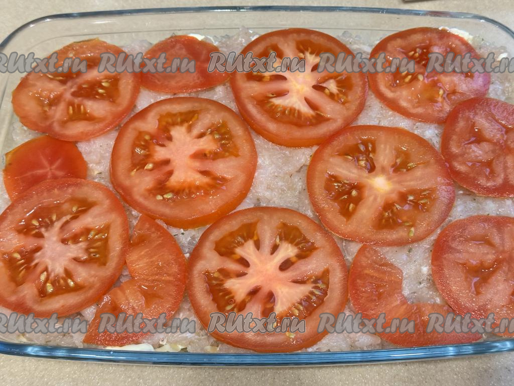 Помидоры нарезать на тонкие кружочки. Поверх фарша разложить кружочки помидора.