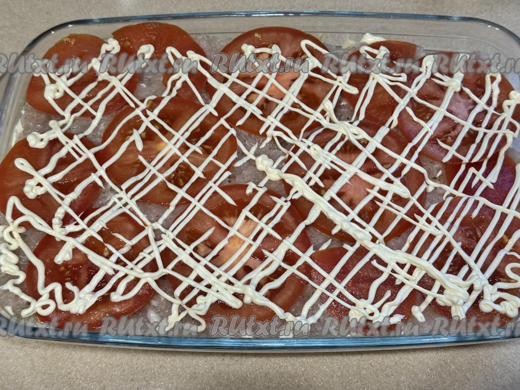 Нанести на помидоры сеточку из майонеза.