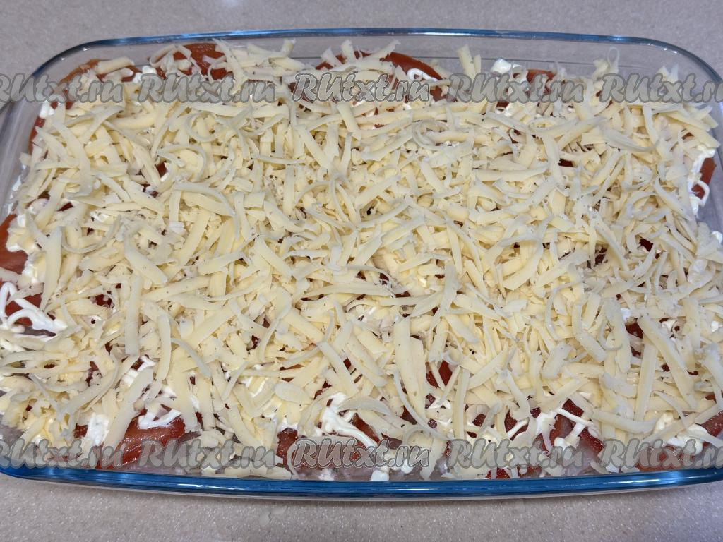 Сыр натереть на крупной тёрке. Картошку, смазанную майонезом, равномерно присыпать небольшим количеством натёртого сыра.
