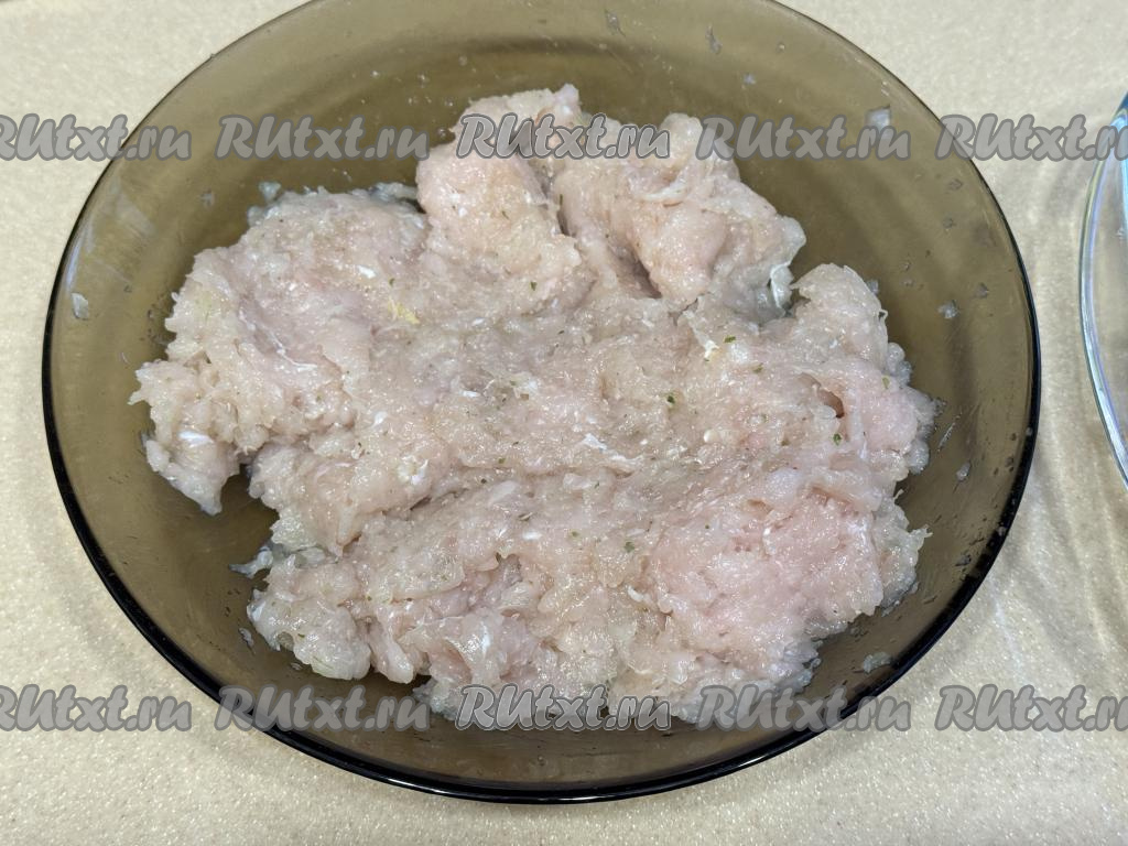 Лук и чеснок пропустить через мясорубку (или измельчить в измельчителе), добавить в миску с куриным фаршем, посолить по вкусу, хорошо перемешать.