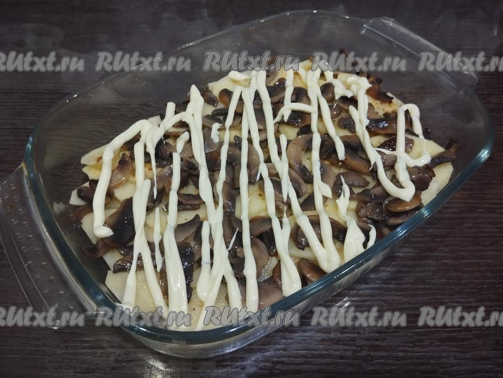 На картофель равномерно раскладываем жареные шампиньоны. Смазываем грибы майонезом.