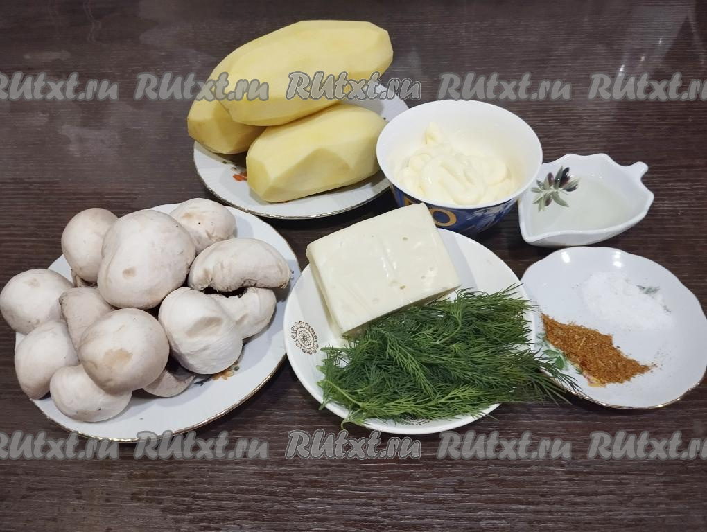 Подготовим продукты. Шампиньоны и зелень укропа промываем водой и обсушиваем. Картофель очищаем.