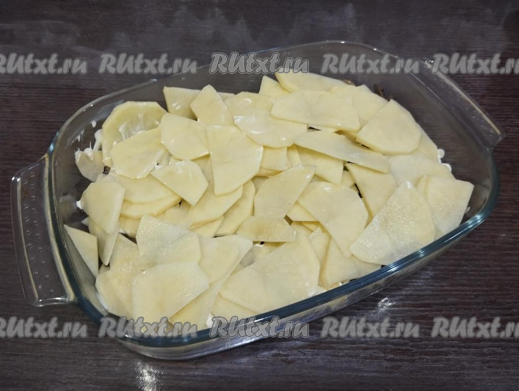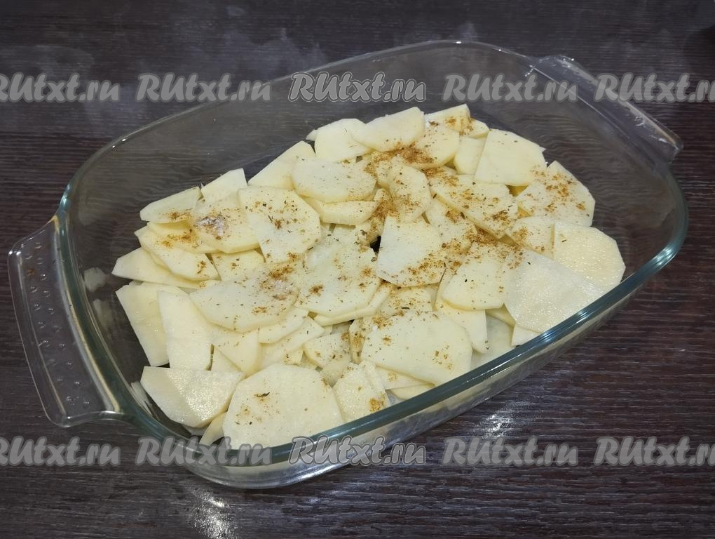 Форму для запекания смазываем оставшимися 2 столовыми ложками масла. Картофель нарезаем на тонкие кружочки или полукружочки (толщина нарезанной картошки должна быть около 3 миллиметров), солим, перемешиваем. Выкладываем половину картошки на дно формы.