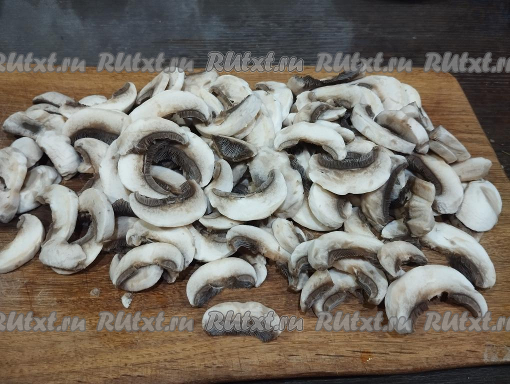Шампиньоны нарезаем на пластины толщиной примерно 3-4 миллиметра.