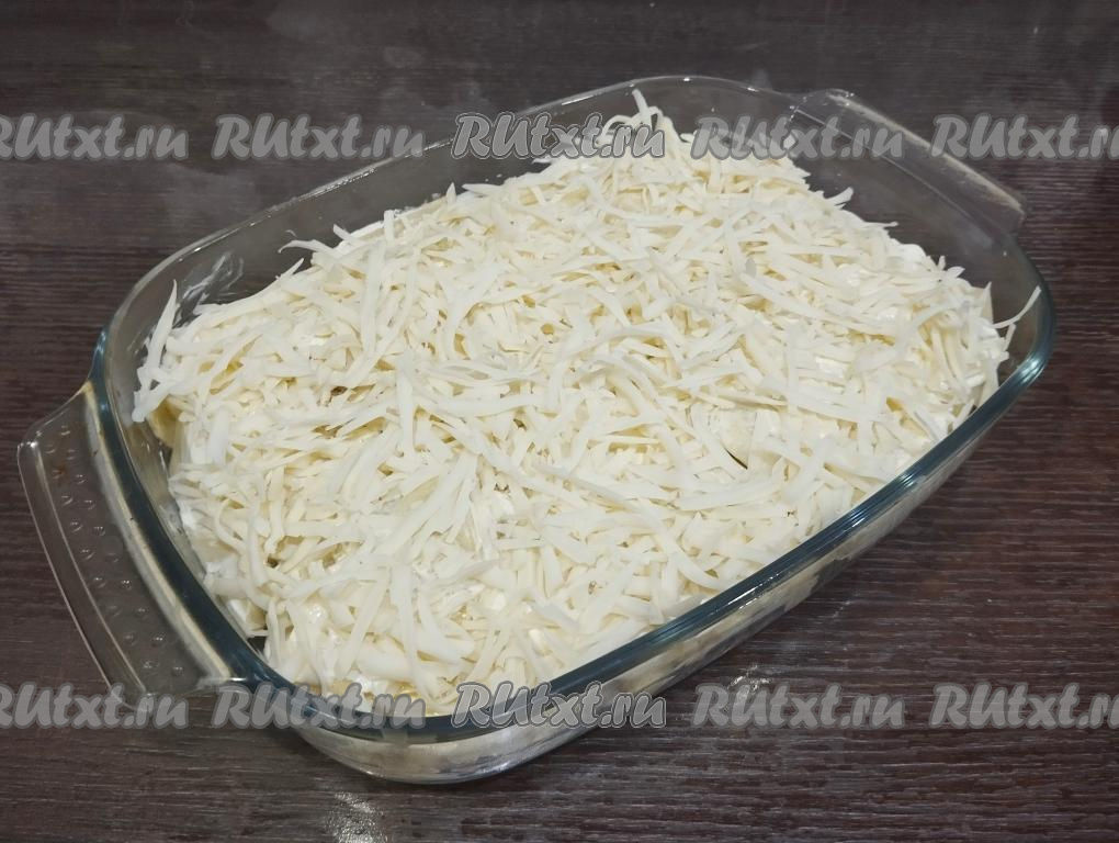Картофель, смазанный майонезом, равномерно посыпаем сыром, натёртым на крупной тёрке.