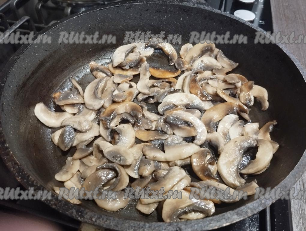 На сковороде разогреваем 2 столовых ложки растительного масла, выкладываем шампиньоны, на огне выше среднего обжариваем грибы до готовности (в течение 6-7 минут), периодически перемешивая. Вода из грибов должна выпариться. В процессе обжаривания шампиньоны солим. Жареные грибы убираем с огня, даём немного остыть.