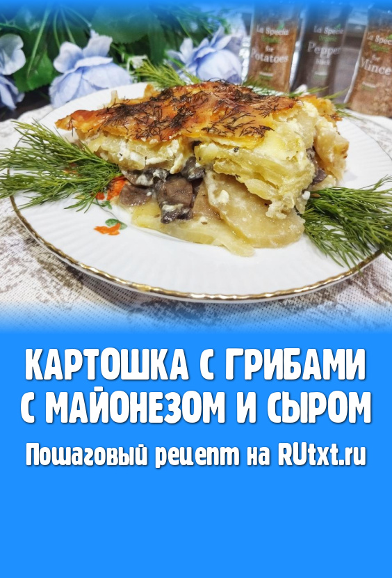 Картошку с грибами под майонезом и сыром запекаем в заранее разогретой до 180 градусов духовке 40 минут. Сыр расплавится и образует на поверхность блюда румяную корочку. Готовность блюда проверяем по картошке, она должна легко прокалываться ножом.