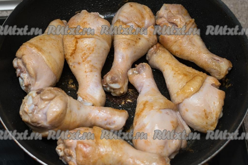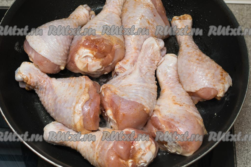 Хорошо прогреть растительное масло в сковороде. Выложить куриные ножки в один слой в сковороду с разогревшимся маслом.