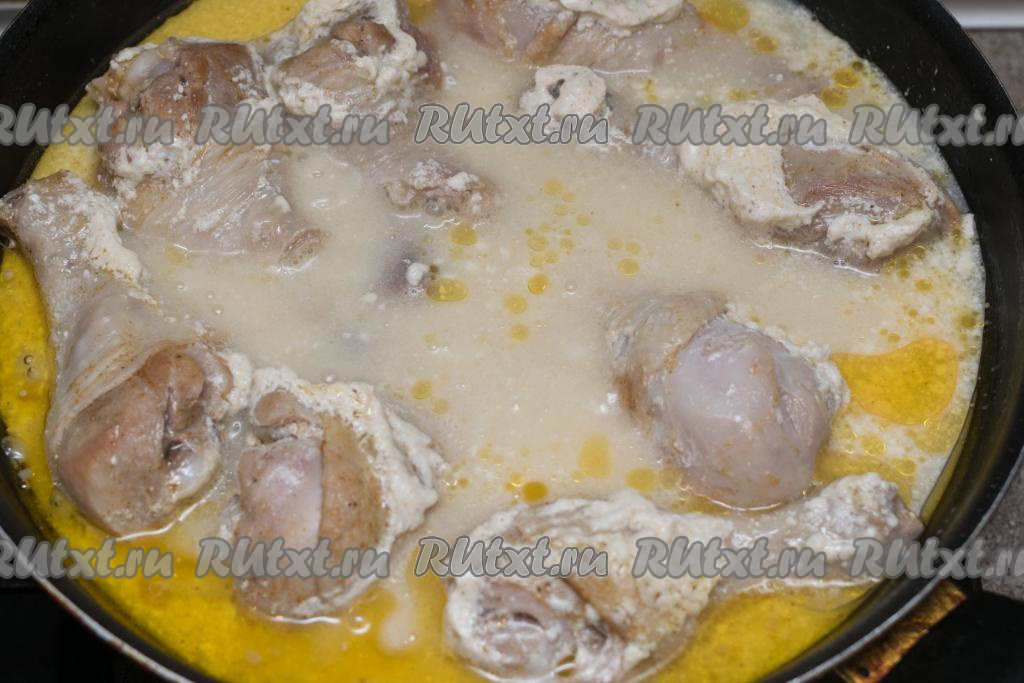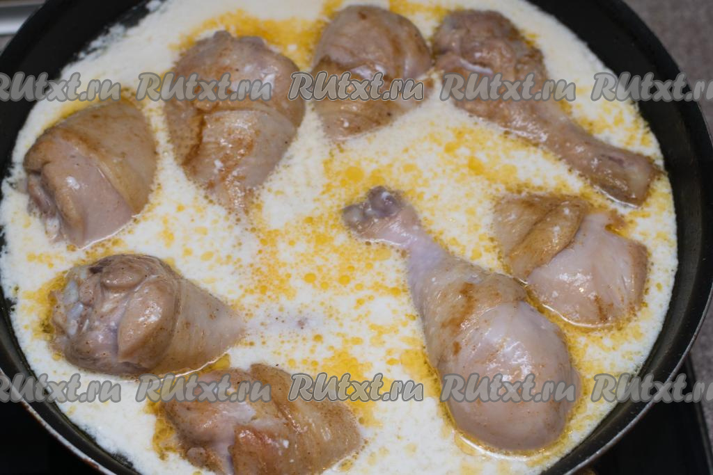 Залить куриные ножки соусом из сметаны, накрыть сковороду крышкой. Довести соус до кипения, уменьшить огонь и тушить мясо в течение 10 минут.