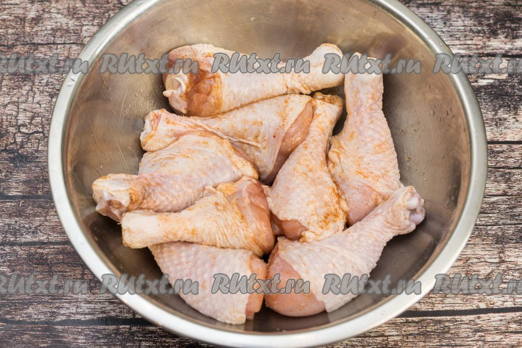 Куриные ножки промыть водой, немного обсушить. Затем посолить, посыпать любимыми специями (я взяла готовые специи для птицы), тщательно перемешать, покрывая ножки солью и специями со всех сторон.