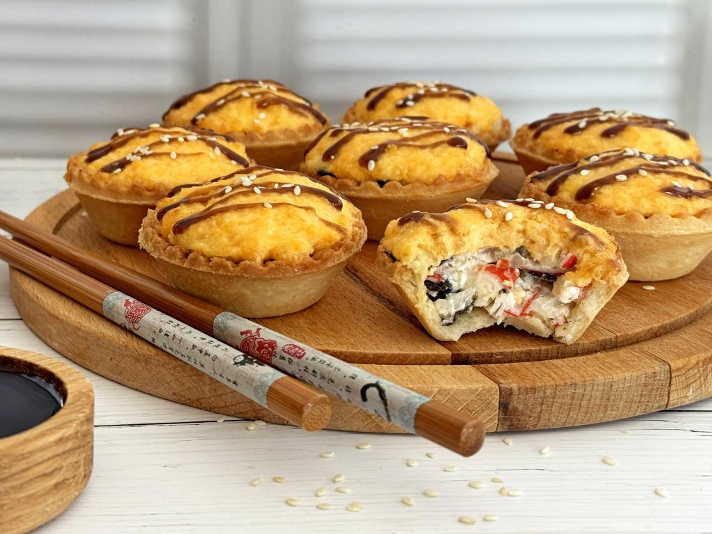 Этот рецепт запечённых суши давно покорил просторы Интернета, вот и я решила приготовить. Формируются суши в покупных песочных тарталетках и просто, и быстро, получаются очень вкусными, насыщенными, покрытыми аппетитной сырной шапочкой. Запекала я их в аэрогриле. С начинками для этих экспересс-суши можно экспериментировать, но мне очень нравится вариант, которым делюсь в этом рецепте. Суши в тарталетках, запечённые в аэрогриле, можно подать и на ужин, и в качестве перекуса, и в качестве закуски на праздничный стол!